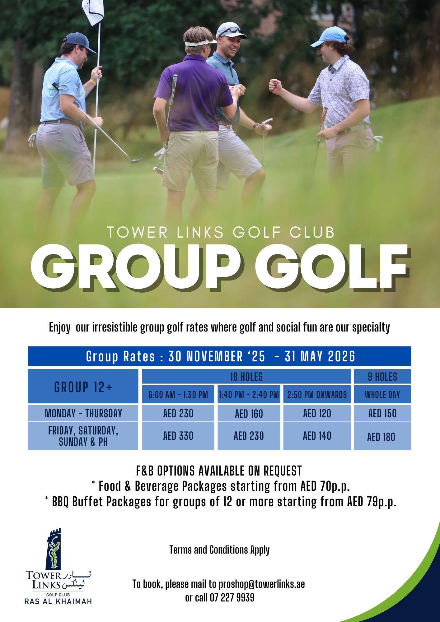 At Tower Links enjoy the best rates on group packages specially designed to make your day with us a complete golf and social experience. We pride ourselves on being the most flexible club in the UAE.